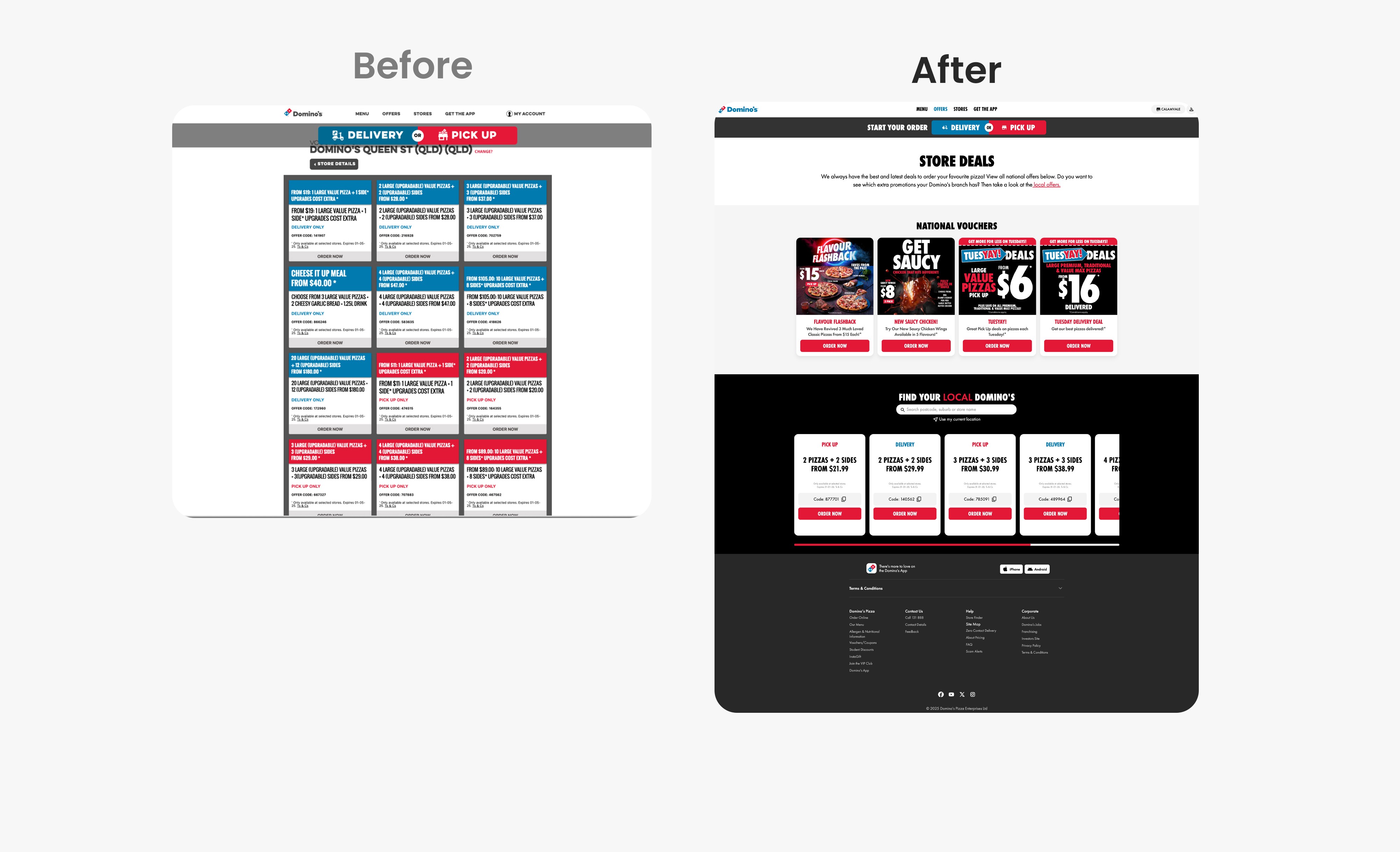 Domino’s had rebranded, but only the homepage reflected it. Key subpages like Offers and Store still felt outdated: text heavy, low visual hierarchy, off brand, and hard to scan.